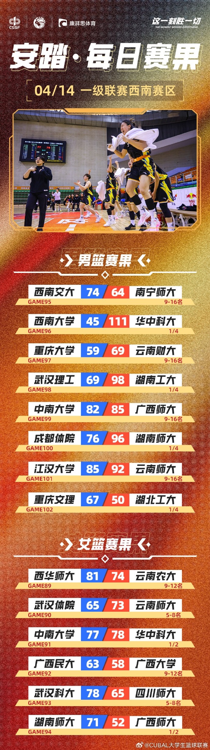 CUBAL今日赛果:中南大学惜败广西师大西南交大力克南宁师大
