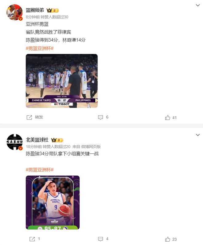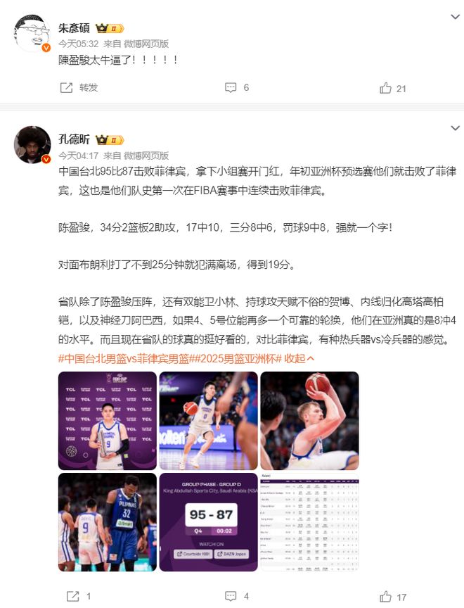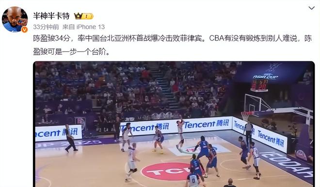 媒体人半神半卡特则写道:陈盈骏34岁率领省队爆冷击败菲律宾,CBA有没有锻炼到别人难说,陈盈骏可是一步一个台阶。