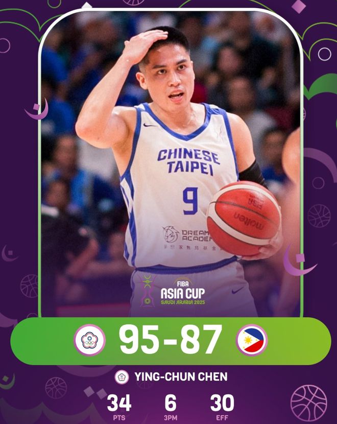北京时间8月6日,男篮亚洲杯小组赛继续进行,中国台北队95-87击败菲律宾男篮拿到开门红。这场比赛陈盈骏的个人发挥相当炸裂,首节14分,半场17分,全场34分,得分占比全队35.8%!这场比赛