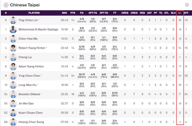 从正负值来看,这支中国台北男篮十分依赖于先发球员:陈盈骏+14、胡珑贸+10、林庭谦+16、高柏铠+7、贺博+14,替补席上只有刘铮+1、陈冠全+3其余的球员正负值皆是负数。