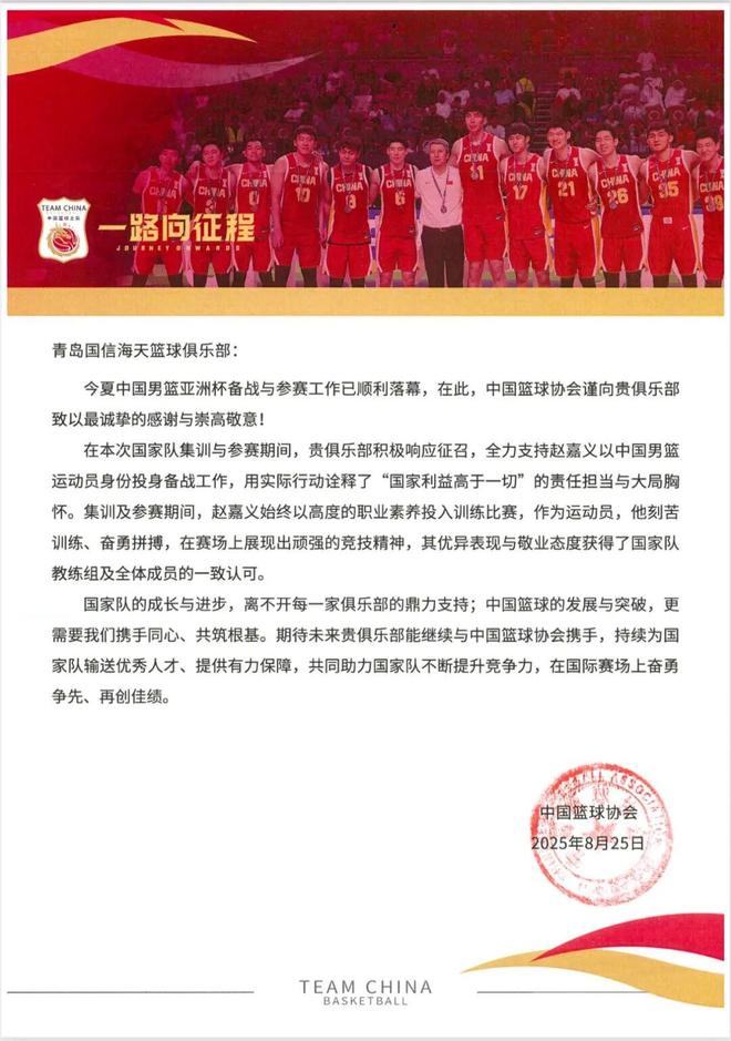 近日,青岛国信海天篮球俱乐部收到中国篮球协会的函件,赵嘉义此次代表中国男篮出征亚洲杯,既是个人荣誉,更是俱乐部的荣光。我俱乐部始终坚信“国家荣誉高于一切”,全力支持球员为