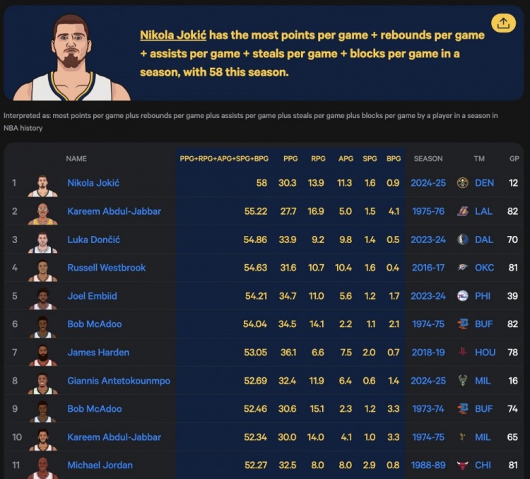据统计,约基奇本赛季至今场均得分+场均篮板+场均助攻+场均抢断+场均盖帽=58,暂列NBA历史单赛季榜单的第一位。