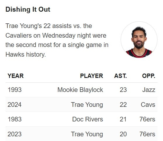 值得一提的是,特雷-杨单场22助攻排在老鹰队史第二位,第一是穆奇-布雷洛克的23次,第三是里弗斯的21次。