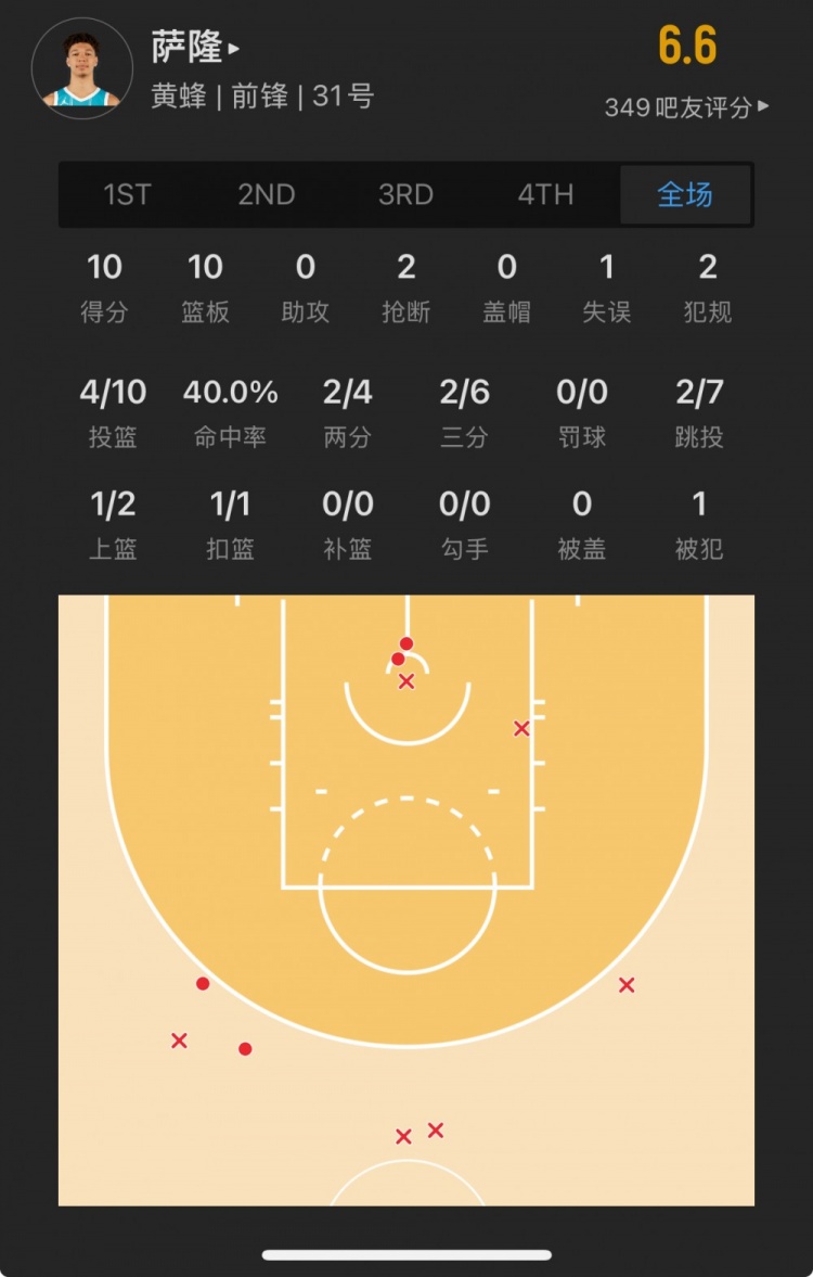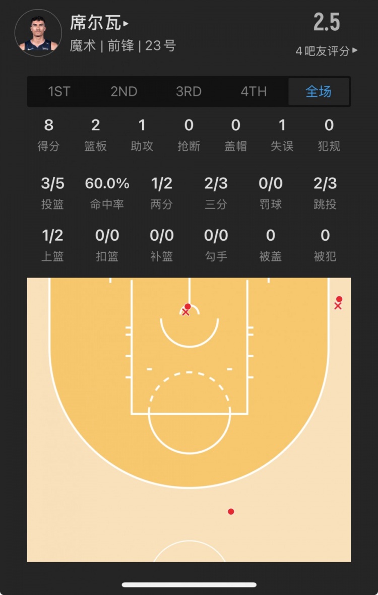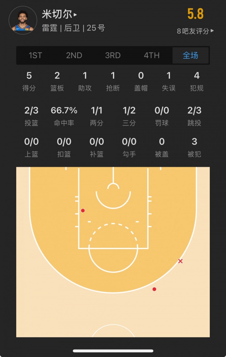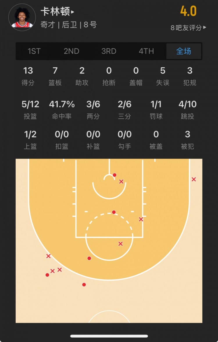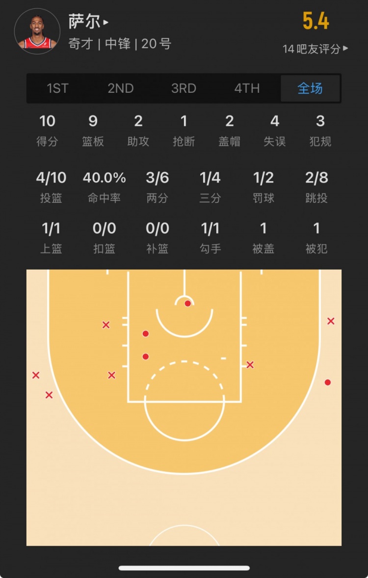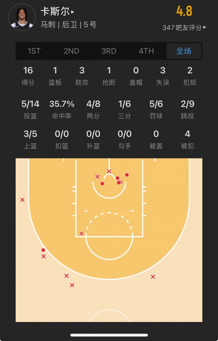 【菜鸟】魔仙哥21分钟10中7得17分卡斯尔14中5谢泼德5中3得6分