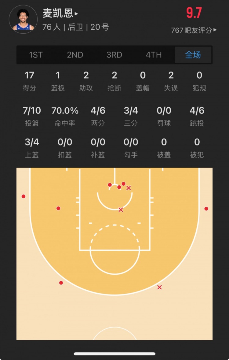 76人16号秀 贾里德-麦凯恩 登场21.6分钟
