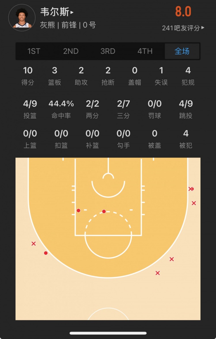 灰熊39号秀 杰伦-韦尔斯 登场21.9分钟