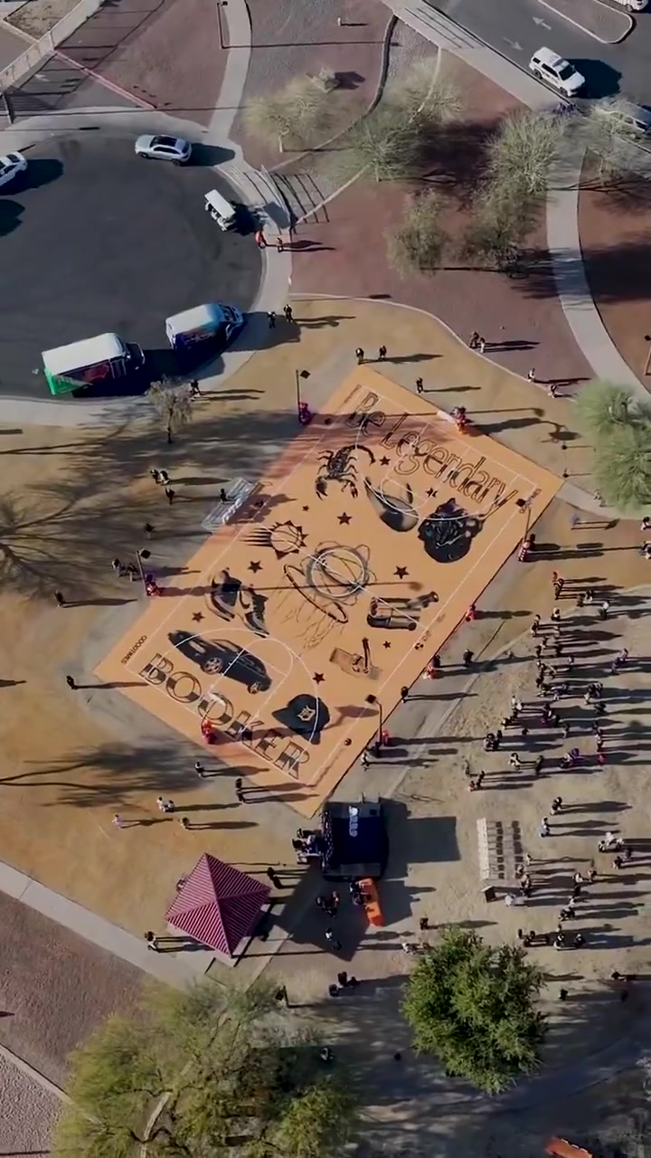 该球场上面写道:“布克,成为传奇(Be Lengendary)。”场上元素还包括布克的签名球鞋、他的爱车和宠物狗。