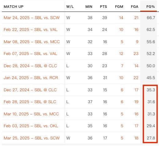 即便放在全发展联盟的视角,布朗尼的出手数也是靠前水平。但这大量出手换来的21.9分,在这些拥有大量出手权的发展联盟球星里,只能是中等偏下的水平。
