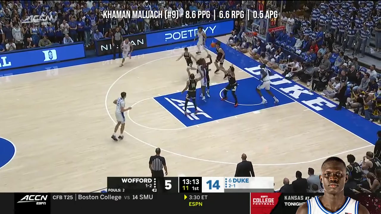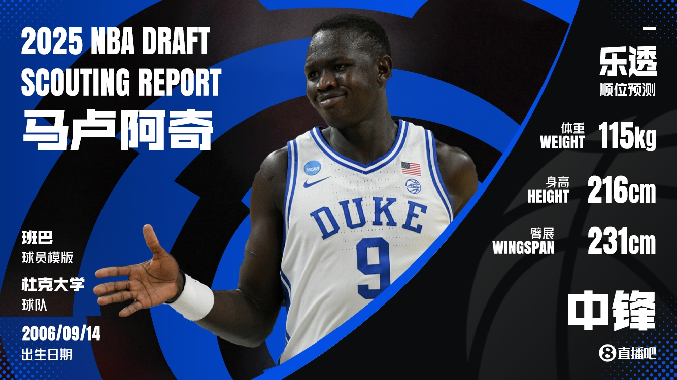 姓名:卡曼-马卢阿奇(Khaman Maluach)出生日期:2006年9月14日位置:中锋球队:杜克大学身高:7尺1(2米16)体重:253磅(115公斤)臂展:7尺7(2米31)球员模版:莱夫利/米切尔-罗宾逊/班巴数据统计:马卢