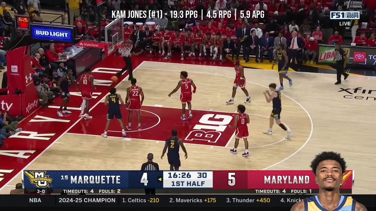 2024-25赛季,卡姆-琼斯一共为马奎特大学打了34场比赛,场均33.8分钟得到19.2分4.5篮板5.9助攻1.4抢断0.3盖帽1.9失误,投篮命中率是48.3%,三分命中率为31.1%,罚球命中率是64.8%。