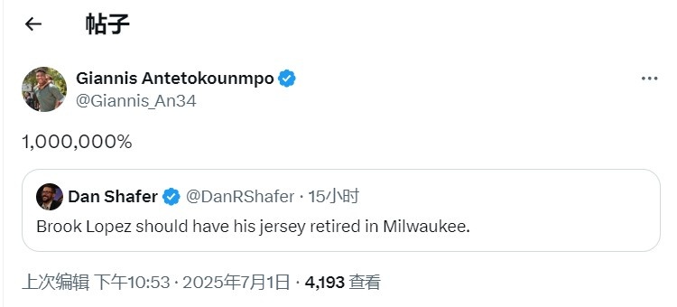 球迷称雄鹿应退役大洛球衣字母哥转发:1000000%的