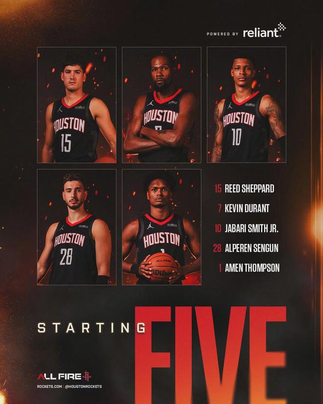 本场火箭首发阵容为谢泼德+阿门+杜兰特+小史密斯+申京,这应该会是很长一段时间的固定首发五虎。