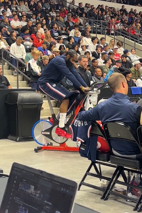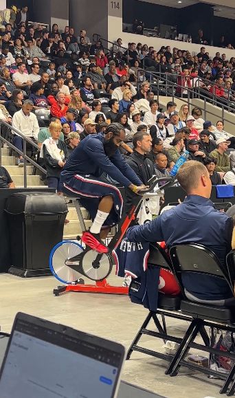 美媒晒出视频,比赛期间哈登在场边进行完整的单车训练。