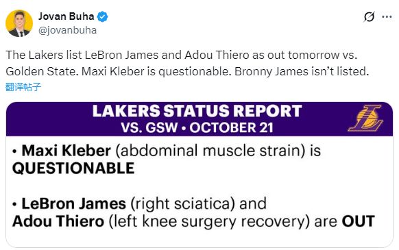 由于遭遇坐骨神经痛的困扰,詹姆斯只能进行个人训练,无法参加合练且确定缺席揭幕战,湖人官方已经公布明日揭幕战对阵勇士的伤病报告,克勒贝尔(腹肌拉伤)出战成疑,50%出战可能性;詹姆斯(右侧坐骨神经痛)和阿杜-蒂耶罗(左膝手术恢复)都因伤缺席比赛。
