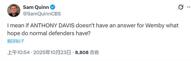 文班亚马的这记背扣技惊四座,让替补席球员以及现场观众当中的很多人纷纷站起来欢呼庆祝,继而有不少人在比划文班的这记扣篮动作。文班亚马变得更加狠辣了。本赛季是文班亚马的第三个赛季,他迎来了巨大的蜕变。NBA记者萨姆·奎因点评了文班这一战的表现,他写道:“我的意思是,如果浓眉都对文班亚马没办法,那么普通防守者有什么希望?”