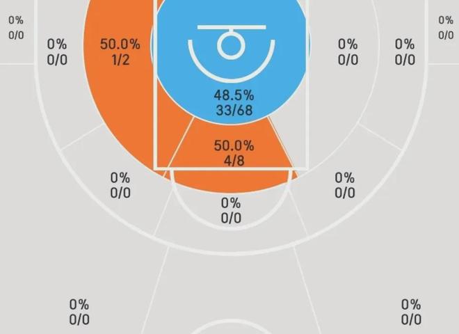 本赛季至今,这哥们约87%的投篮全部集中在内线,中远距离得分基本上没有。