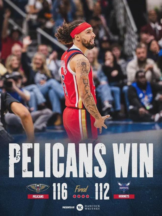 西部垫底大战东部第11,鹈鹕116-112击败黄蜂,拿下本赛季首胜,目前战绩为1胜6负。