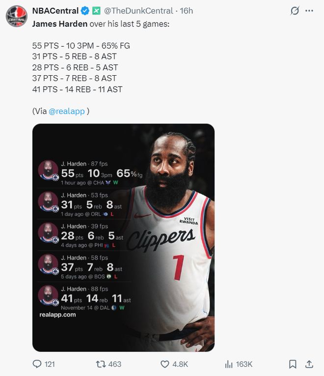 3.55分是哈登赛季新高得分;