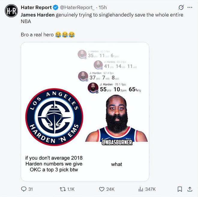 赛后美媒Hater Report写道:真心觉得詹姆斯-哈登一人拯救了一支NBA球队,他是真正的孤胆英雄。