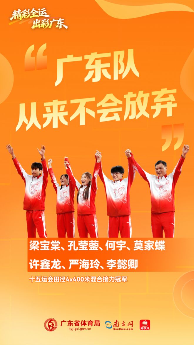 “过去四年,运动员们努力拼搏,教练团队辛勤付出,医疗保障人员加班加点,六枚沉甸甸的金牌背后,是广东田径团队力量的胜利!”