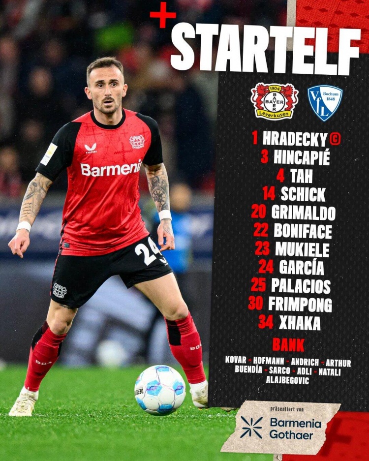 勒沃库森vs波鸿首发:希克、扎卡先发博尼法斯、弗林蓬出战
