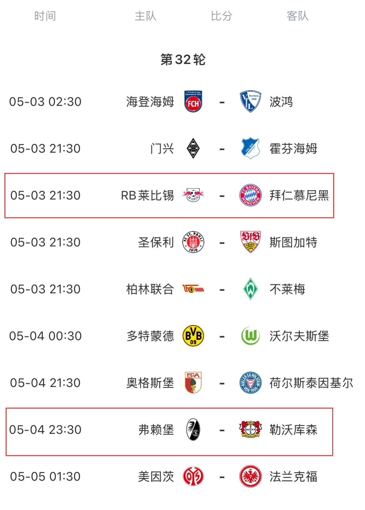 拜仁在仅剩3轮的情况下手握8分优势,下一轮拜仁先客战莱比锡(5月3日21:30),勒沃库森后客战弗莱堡(5月4日23:30)。拜仁如果赢球就能确保提前2轮夺冠。