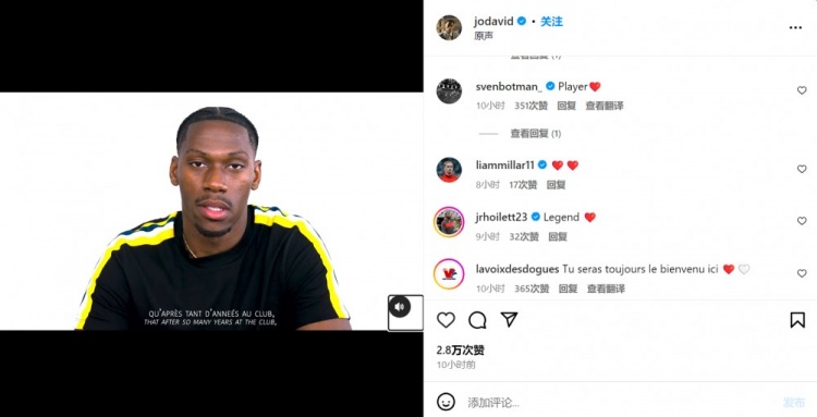 5月15日讯 乔纳森-戴维在个人社交媒体发布视频,告别了里尔。