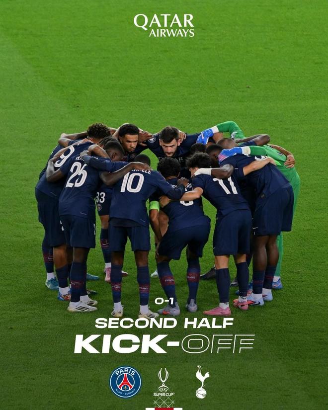 伤停补时阶段,巴黎圣日耳曼防线再次告急,理查利森禁区内头球摆渡,库杜斯门前接力鱼跃冲顶,可惜打在立柱上弹出。上半场,巴黎圣日耳曼控球率高达70%,但热刺更加高效,9次射门3次射正打进1球,带着1球优势进入更衣室。