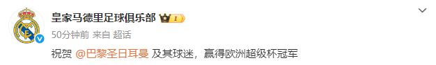 在比赛结束之后,皇家马德里官方向巴黎圣日耳曼送上了祝贺,他们表示:祝贺巴黎圣日耳曼俱乐部及其全体球迷赢得当之无愧的欧洲超级杯冠军。