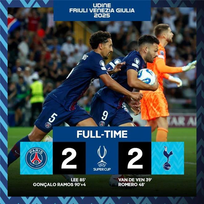 北京时间8月14日凌晨3点,欧洲超级杯在意大利乌迪内弗留利体育场打响,由上赛季欧冠冠军巴黎圣日耳曼对阵上赛季欧联杯冠军托特纳姆热刺。此役范德文和罗梅罗各建一功,热刺一度2-0领先,李刚仁和拉莫斯两名替补破门,巴黎圣日耳曼连扳2球,双方常规时间战成2-2!