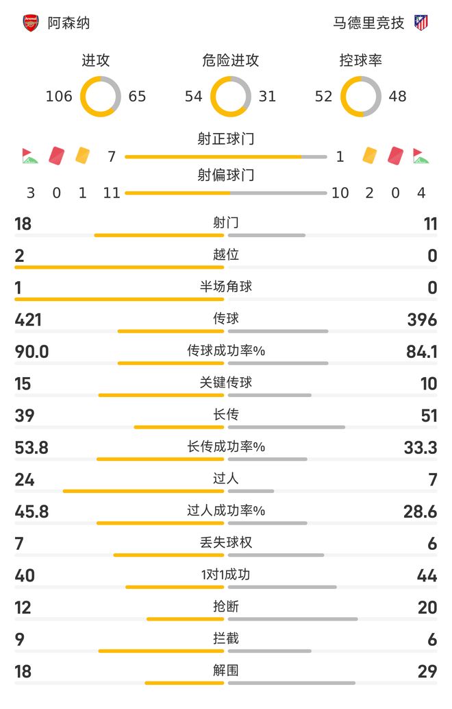 射门数据方面,阿森纳全场18次射门其中7次射正攻入4球,马德里竞技全场11次射门但仅1次射正。