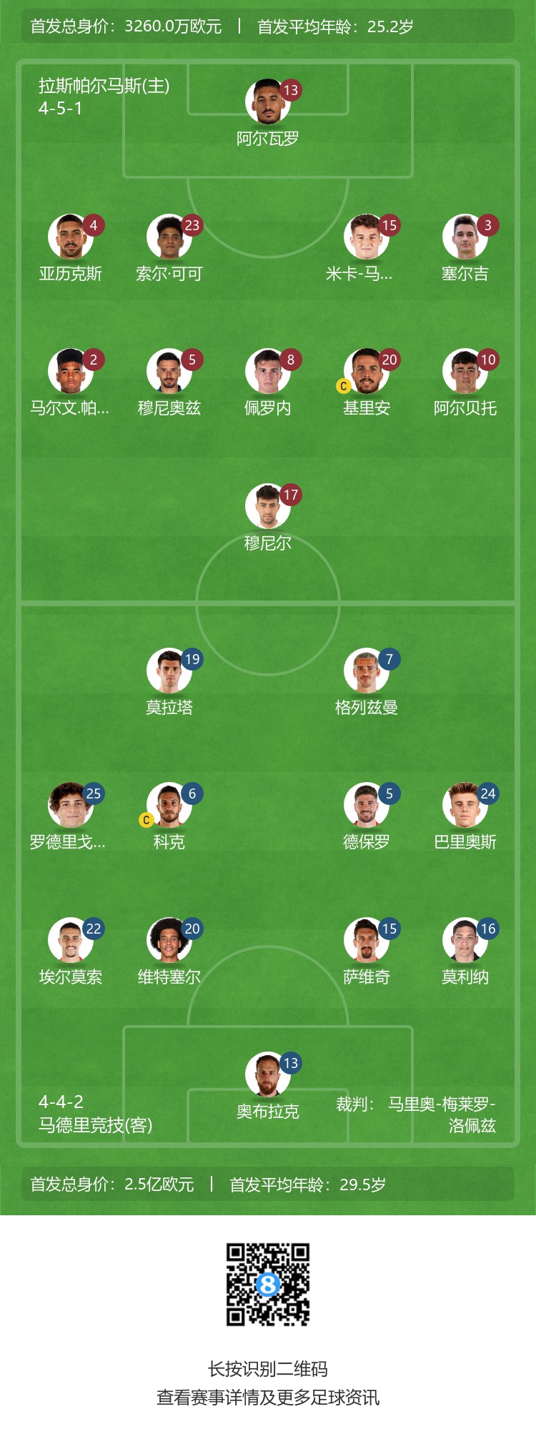 拉斯帕尔马斯首发:13-阿尔瓦罗-瓦莱斯、15-米卡-马尔莫尔、4-亚历克斯-苏亚雷斯、3-卡尔多纳、23-科科、20-基里安-罗德里格斯、5-哈维-穆尼奥斯、10-阿尔贝托-莫莱罗、8-佩罗内、2-马尔温、17-穆尼尔