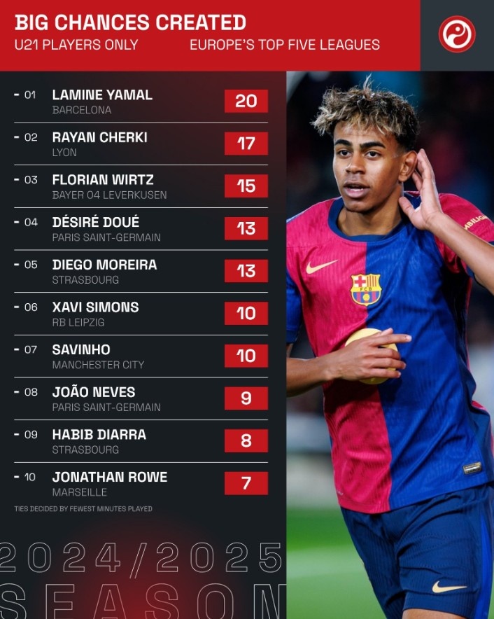 3月27日讯 《Squawka》统计出了本赛季创造重大机会最多的五大联赛U21球员top10,亚马尔以20次居首,至于运动战创造机会方面,维尔茨和亚马尔则以46次并列榜首。本赛季五大联赛U21
