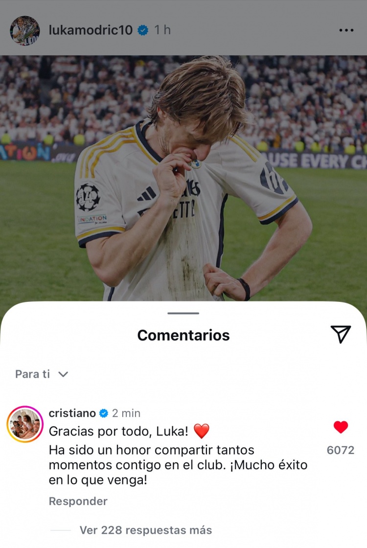莫德里奇通过社交媒体自宣将在世俱杯后离开皇马,曾经在皇马与他共事多年的C罗也在社交媒体上回复了他。