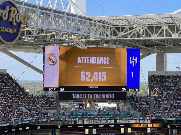 6月19日讯 现场播报数据显示,皇马1-1利雅得新月的世俱杯小组赛首轮共有62415名球迷现场观赛。