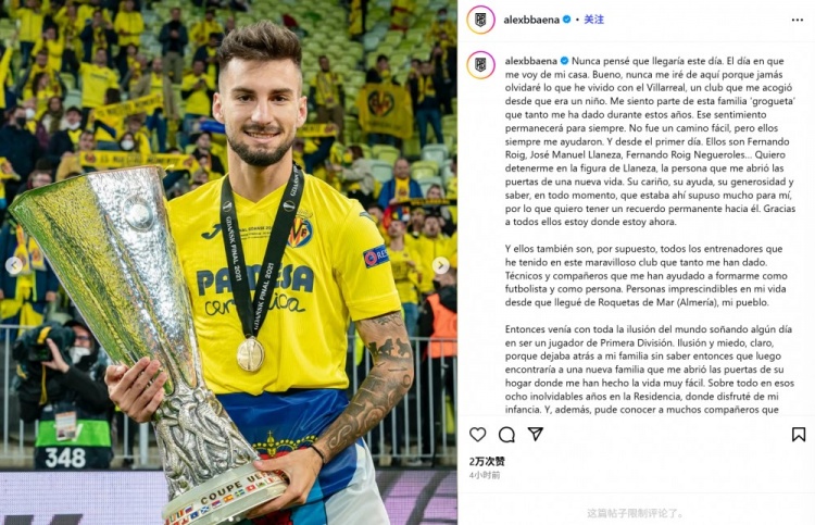 巴埃纳撰文如下:从未想过这一天——离开家的日子——会真的来临。不,我永远不会真正离开,因为比利亚雷亚尔——这个自我童年便接纳我的俱乐部,所有经历将永存心底。我始终是"黄色潜水艇"大家庭的一员,这些年我得到了数不清的善意馈赠。这份情感永不褪色。征途漫漫,但俱乐部始终伴我前行。