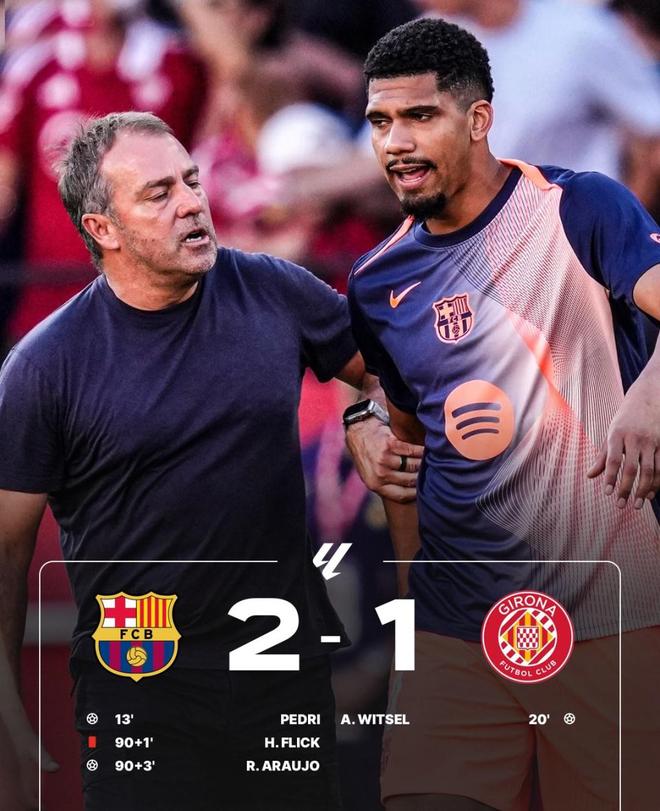 仅仅过了3分钟,场上出现戏剧性一幕,德容右路倒三角回传,阿劳霍压上到禁区前沿,甩头抢点破门,2-1,巴萨读秒完成绝杀,可把刚才一脸怒气的弗里克乐开了花。