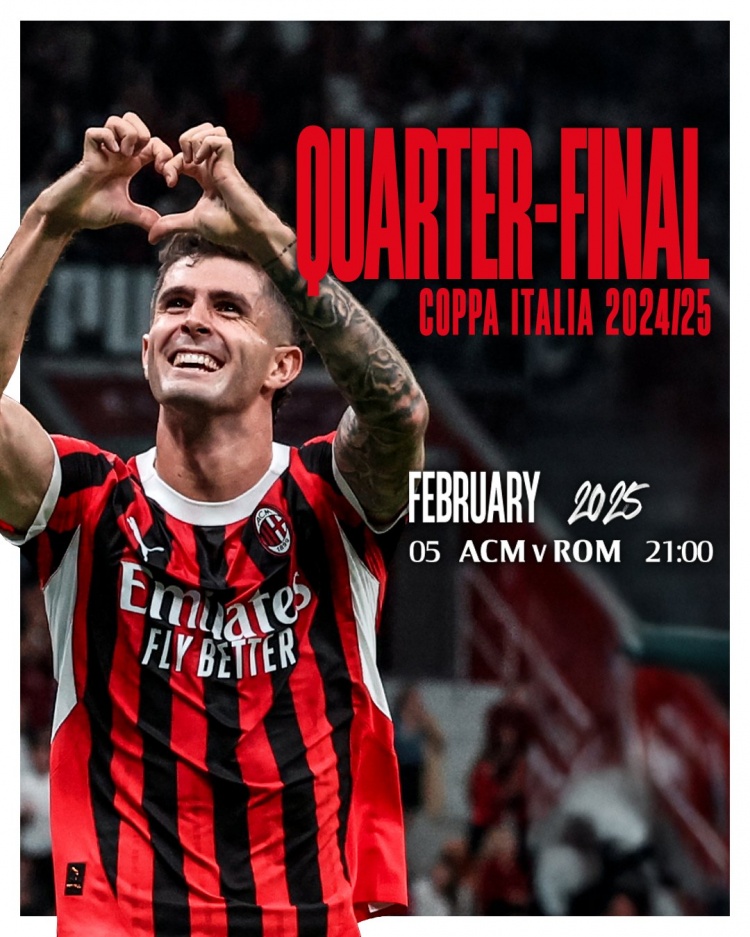 1月13日讯 米兰在意大利杯1/8决赛中击败萨索洛,将与罗马在1/4决赛中展开较量。米兰官方社媒晒出海报,确认对阵罗马的意大利杯比赛将在北京时间2月6日4点开球。