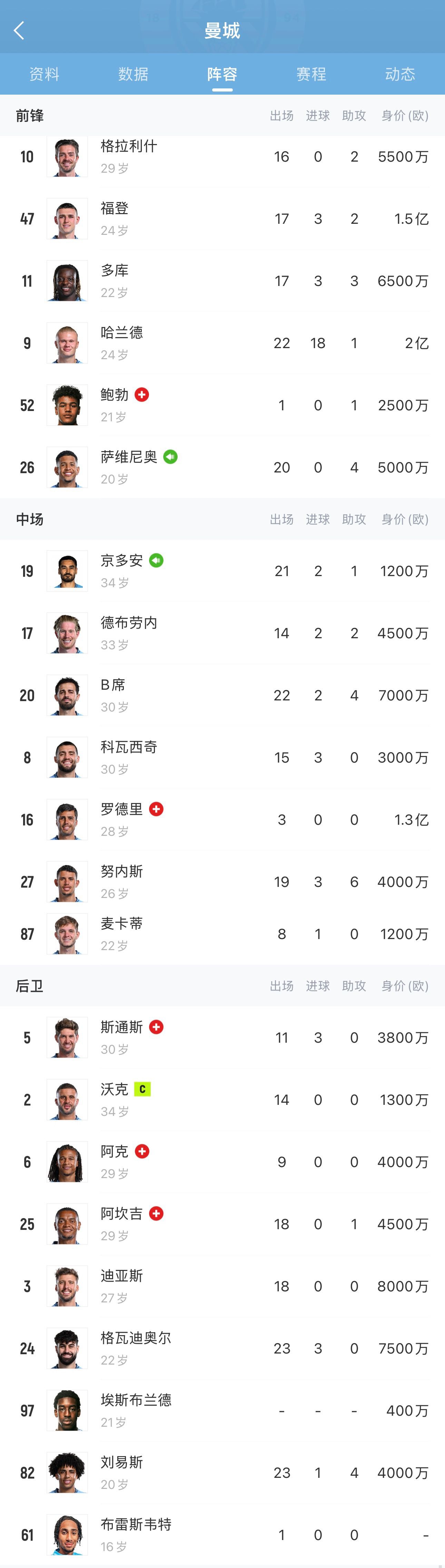 曼城伤员:鲍勃(腿部骨折)、罗德里(十字韧带撕裂)、斯通斯(未知伤病)、阿克(未知伤病)、阿坎吉(未知伤病)