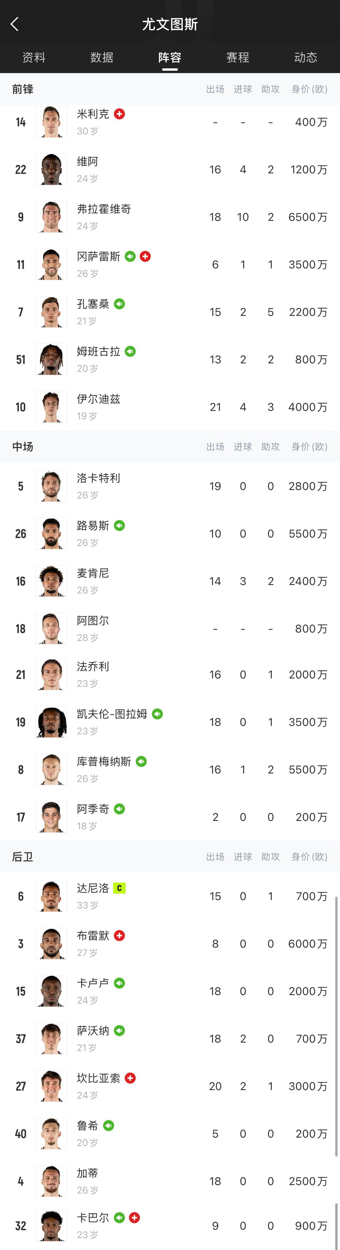 尤文伤员:米利克(膝关节损伤)、冈萨雷斯(肌肉问题)、布雷默(十字韧带撕裂)、坎比亚索(脚踝问题)、卡巴尔(十字韧带手术)