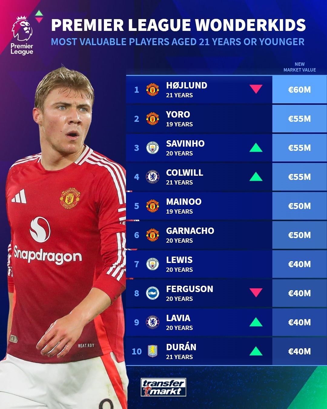 12月17日讯 德转盘点了英超U21球员身价前十榜单,霍伊伦6000万欧最贵,曼联4位球员在列。