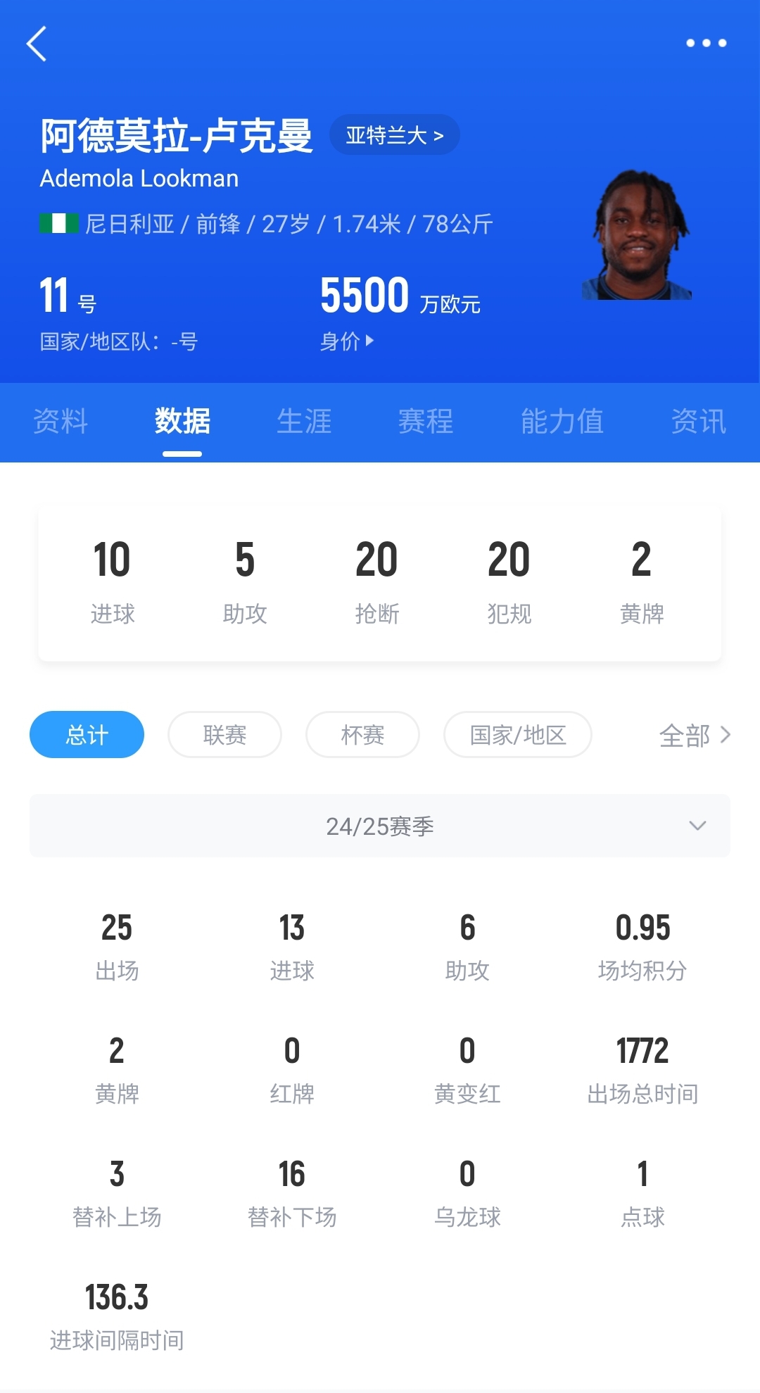 本赛季至今,27岁的卢克曼代表亚特兰大出战25场比赛,贡献13球6助,球员德转身价涨至5500万欧,创个人生涯新高。