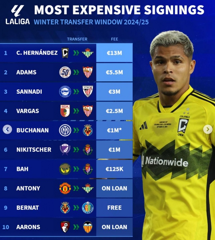 德转列西甲冬窗引援最贵阵:库乔标王,布坎南、安东尼在列