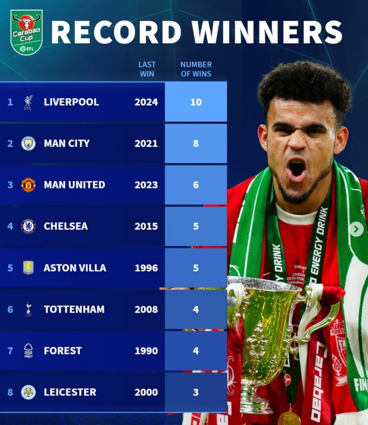 联赛杯历史夺冠榜:利物浦10冠居首,曼城8冠、曼联6冠