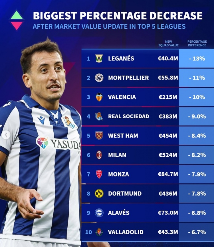 五大联赛球队身价贬值比例榜:米兰多特下降约8%,皇社西汉姆在列