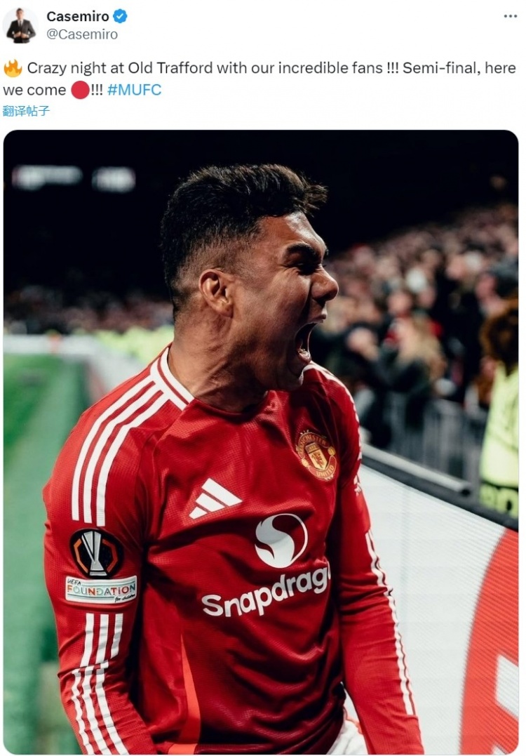 曼联中场卡塞米罗此役踢满120分钟,加时赛造点+助攻双响,赛后他在社交媒体上晒出庆祝的照片,配文:“与我们不可思议的球迷一起度过老特拉福德的疯狂夜晚!半决赛,我们来了!”