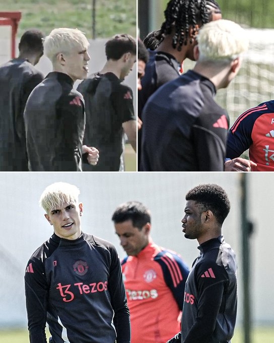 5月20日讯 ESPN晒出了曼联的训练照,可以看到曼联边锋加纳乔在欧联杯决赛前将自己的头发染成了白色。
