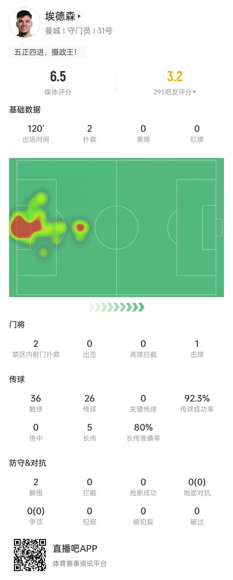 埃德森本场数据:120分钟2次扑救丢4球,传球成功率92.3%&评分6.5