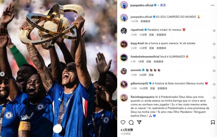 决赛破门!蓝军新援若昂佩德罗社媒晒捧杯照:我是世界冠军!