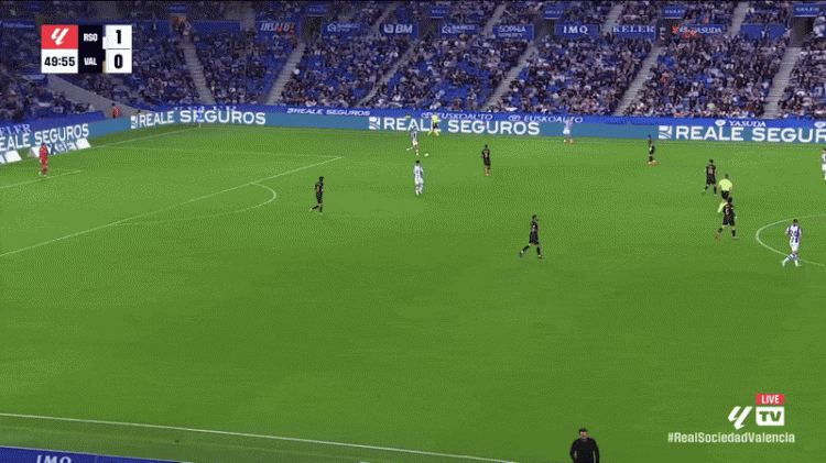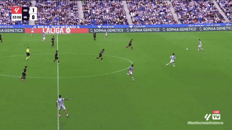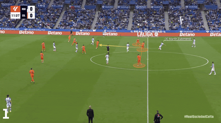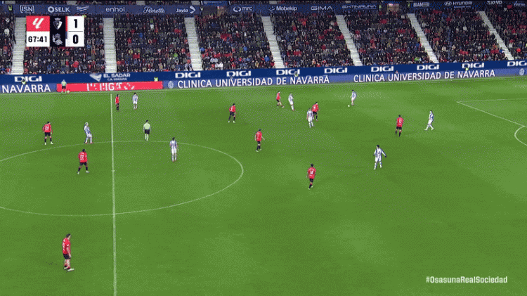 在下一个对阵毕巴的例子中,祖比门迪的表现更具穿透力。他拉边接应边后卫哈马里-特拉奥雷的传球,这一跑动对帮助皇家社会摆脱激进的人盯人压迫至关重要。